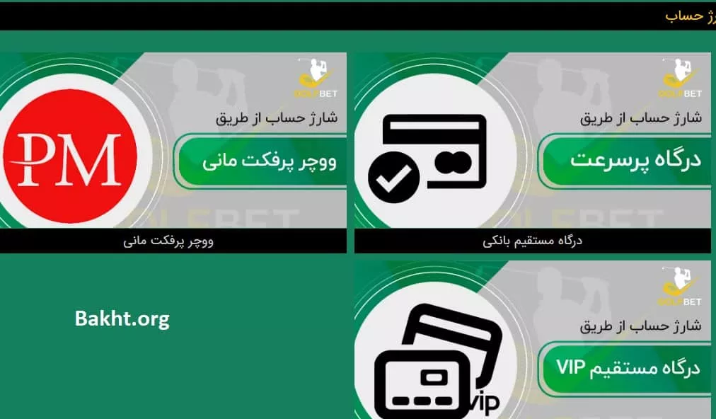 برای شارژ حساب در سایت گلف بت، درگاه مستقیم بانکی، درگاه وی آی پی و ووچر پرفکت مانی از روشهای در دسترس برای شارژ حساب هستند.