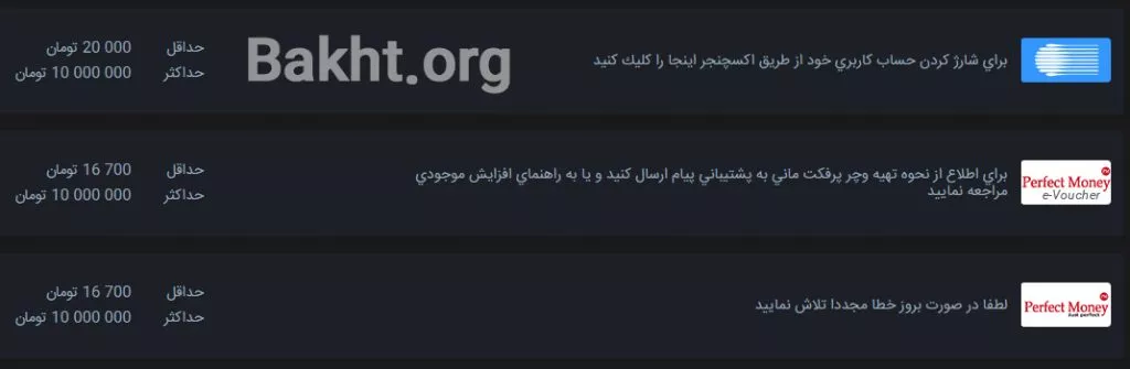 | روشهای واریز | ریالی، پرفکت مانی، ارز دیجیتال |