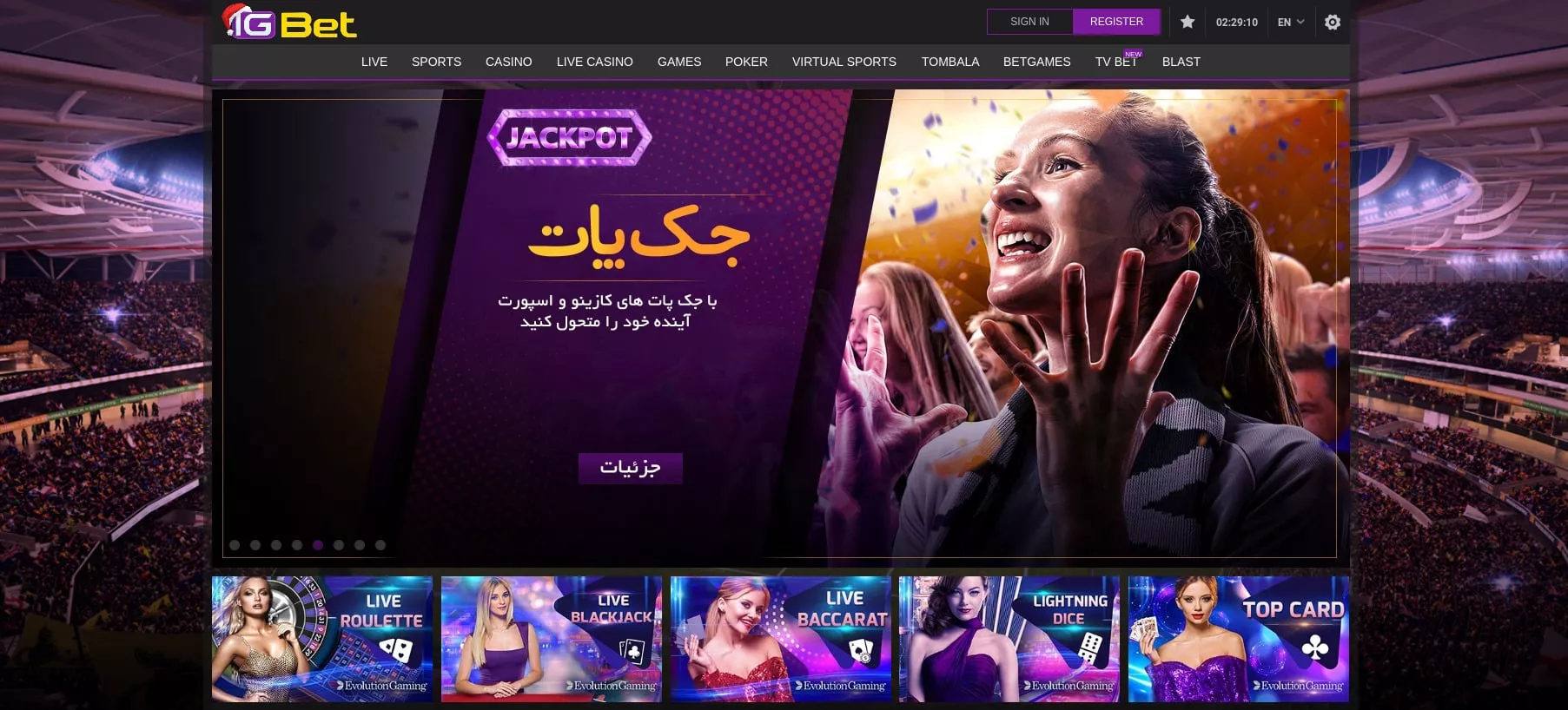 سایت شرط بندی آی جی بت (انگلیسی: IG BET) یک نمایندگی فارسی از سری وبسایتهای شرط بندی خارجی دارای مجوز از کشور کوراسائو است. آی جی بت دارای بخشهای پیش بینی ورزشی، پیش بینی زنده، کازینوی زنده و کازینوی آنلاین است.