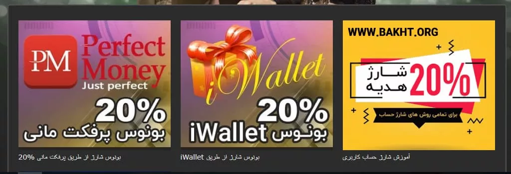 شارژ حساب کاربری در سایت بت بوی از طریق پرفکت مانی و IWallet انجام می شود. به ازای هر واریز از این دو طریق، 20 درصد شارژ بونوس به شما داده میشود.