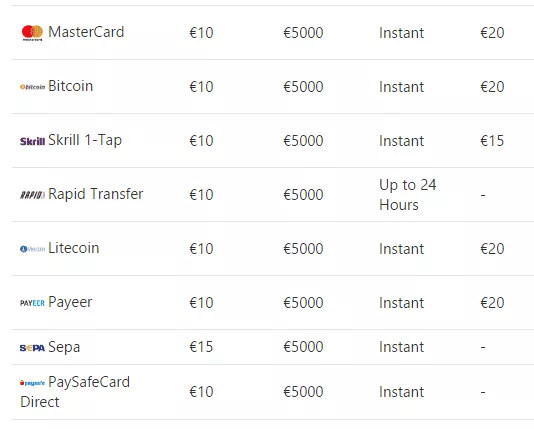 حداقل مبلغ لازم برای شارژ حساب 10 یورو و حداکثر 5 هزار یورو است. این سایت از جمله سایتهای شرط بندی بلاکچینی است.