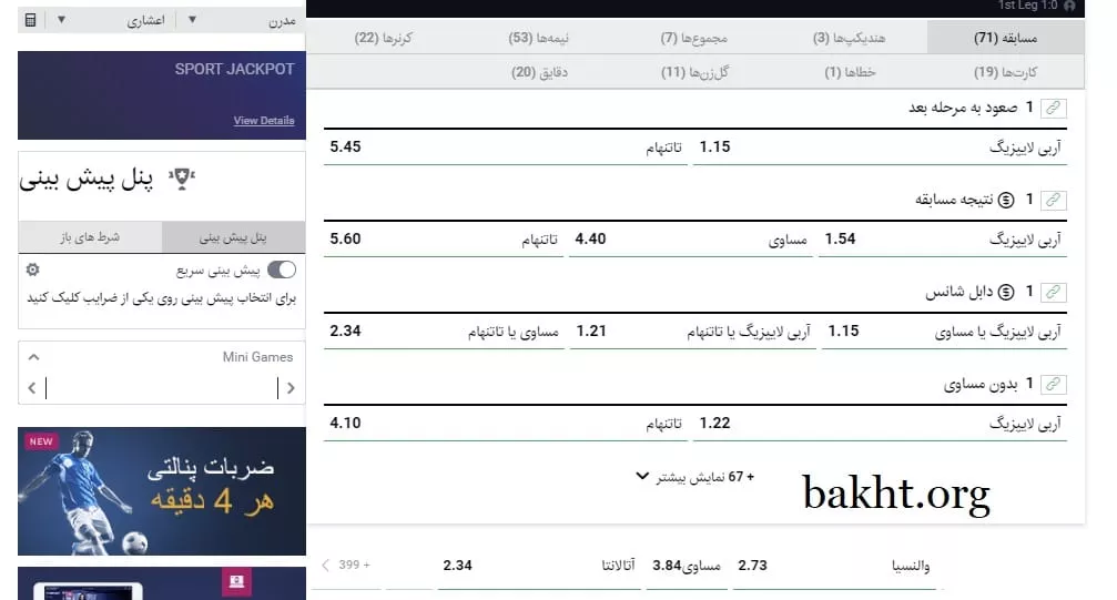 از آنجایی که از تم تیرهی سایتهای شرط بندی اخیر خسته شده بودیم، تم را به «مدرن» تغییر دادیم و نتیجه را در تصویر زیر میبینید. آیتمهای شرط بندی لایپزیش–تاتنهام را مشاهده میکنید. آپشنهای شرط بندی برای دیدارهای مهم بین 200 تا 400 متغیر هستند که عدد متوسطی است. برای مثال سراغ بخش خطاها رفتیم و تنها گزینه وقوع یا عدم وقوع پنالتی بود که جا داشت گزینههای بیشتری نیز دخیل شود.