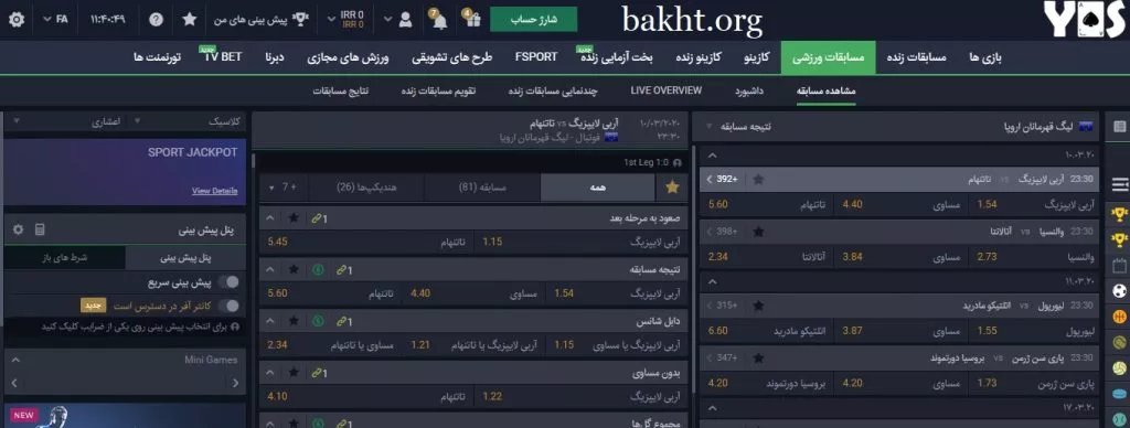 این صفحه شرط بندی ورزشی یاس بت است. بازیهای مهم در بالا هستند و از سمتی توانایی تغییر فرمت ضرایب شرط بندی را نیز دارید. جدا از این، ماشین حساب و تمهای متفاوتی نیز برای استفاده دارید. چند دیدار لیگ قهرمانان که امشب برگزار میشوند به عنوان مهمترین مسابقات در بالای لیست قرار دارند و از سوی دیگر، برای برخی آیتمها توانایی کش-اوت پیش از بازی را نیز دارید.