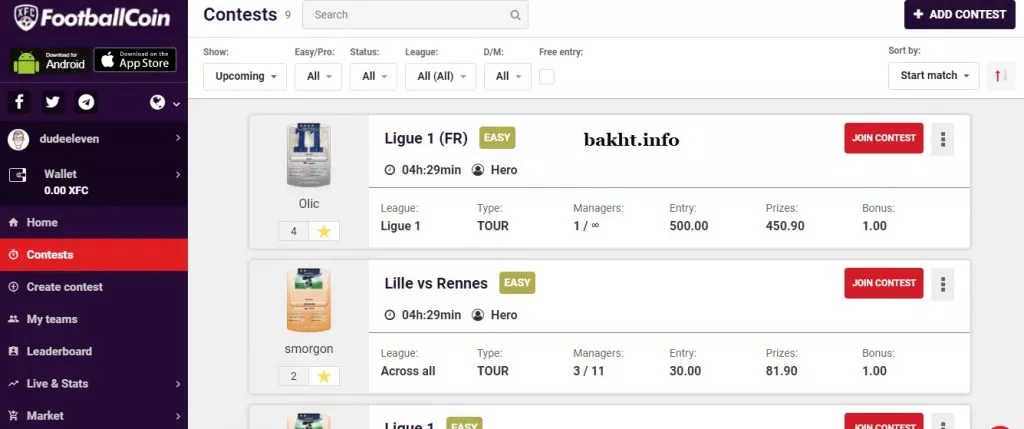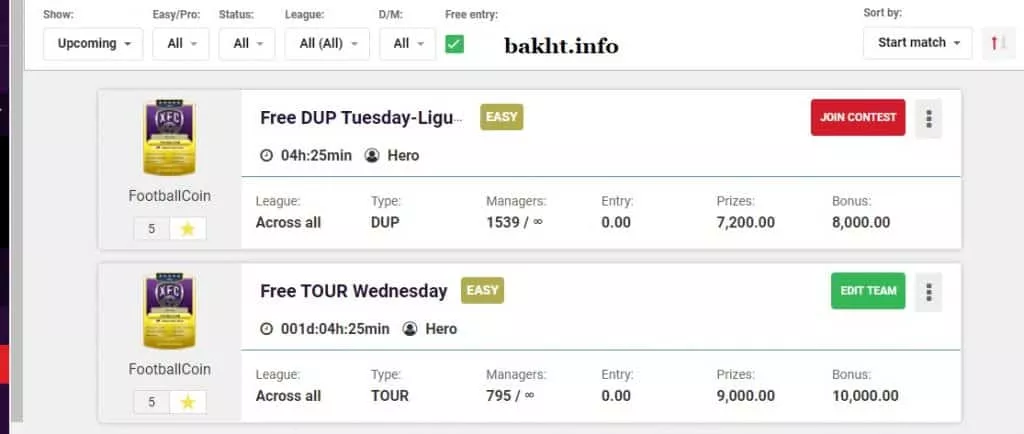 پیش از شارژ حساب، نمیتوانید به هرکدام از کانتستها Join شوید. با این جایی برای نگرانی نیست. کافی است روی آپشنِ free entry کلیک کنید تا وارد کانست های رایگان پیش رو شوید. با کلیک روی آن آپشن، متوجه میشویم (با توجه به اینکه وسط هفته اروپاییها هستیم) تنها دو کانتست رایگان وجود دارد که میتوانیم به آنها Join شویم و ترکیب بسازیم. این کانتستها اگرچه رایگان هستند، برای نفرات نخست آن بونسهایی تا 8000 XFC پیش بینی شده است.