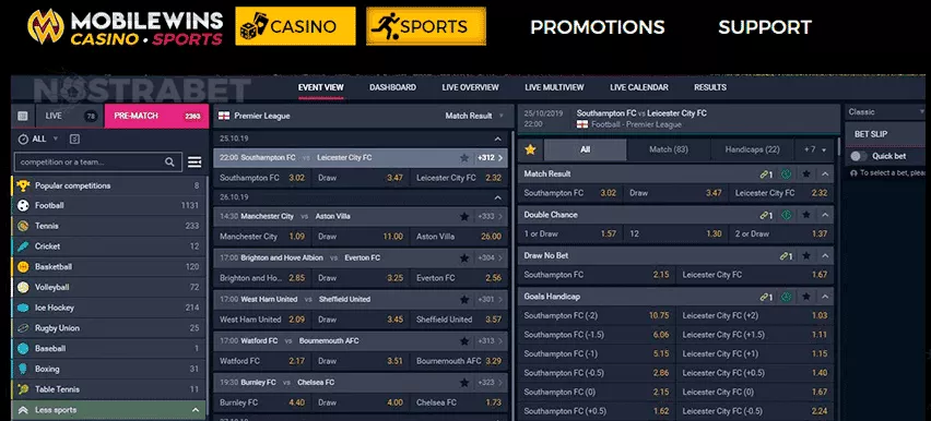 تنیس، فوتبال، کریکت، بسکتبال، والیبال، هاکی روی یخ، راگبی، بیسبال، بوکس، تنیس روی میز و هندبال از جمله مهم ترین رشتههای ورزشی قابل پیش بینی در این سایت شرط بندی هستند.