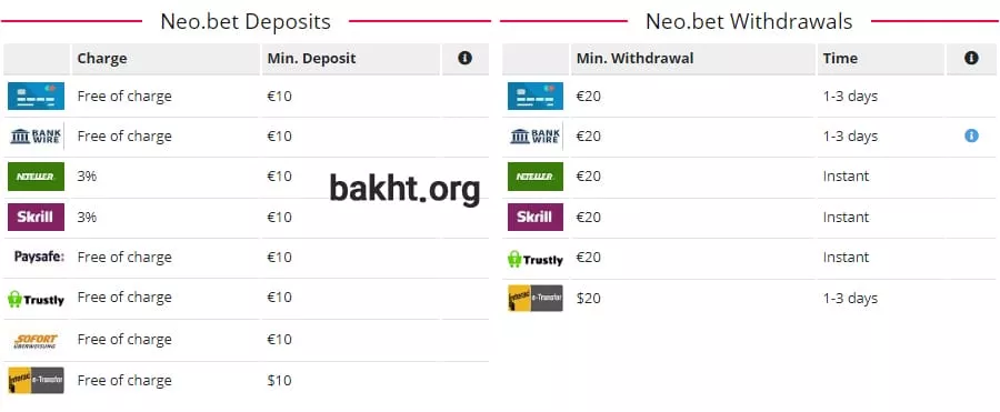 شارژ حساب در سایت نئو بت، از روش های مختلفی امکان پذیر است. روش های netteler و Skrill، سه درصد کارمزد شارژ حساب دارد (مابقی روشها بدون کارمزد است ) حداقل مبلغ برای شارژ حساب 10 یورو است.