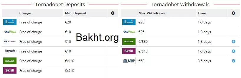 شارژ در سایت تورنادو بت به روش های مختلفی قابل انجام است، Skrill، Paysafe و پرداخت با کردیت کارت، از جمله روش هایی است که در دسترس است. حدقال مبلغ برای شارژ حساب 10 یورو است.
