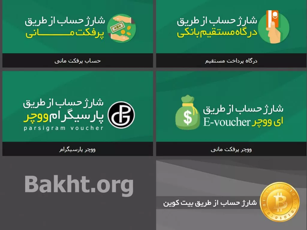 پرفکت مانی، درگاه بانکی، ای ووچر، پارسیگرام و بیت کوین، روش های در دسترس شما برای شارژ حساب در ایرانیان بت است. حداقل مبلغ برای شارژ حساب 5 هزارتومان است.