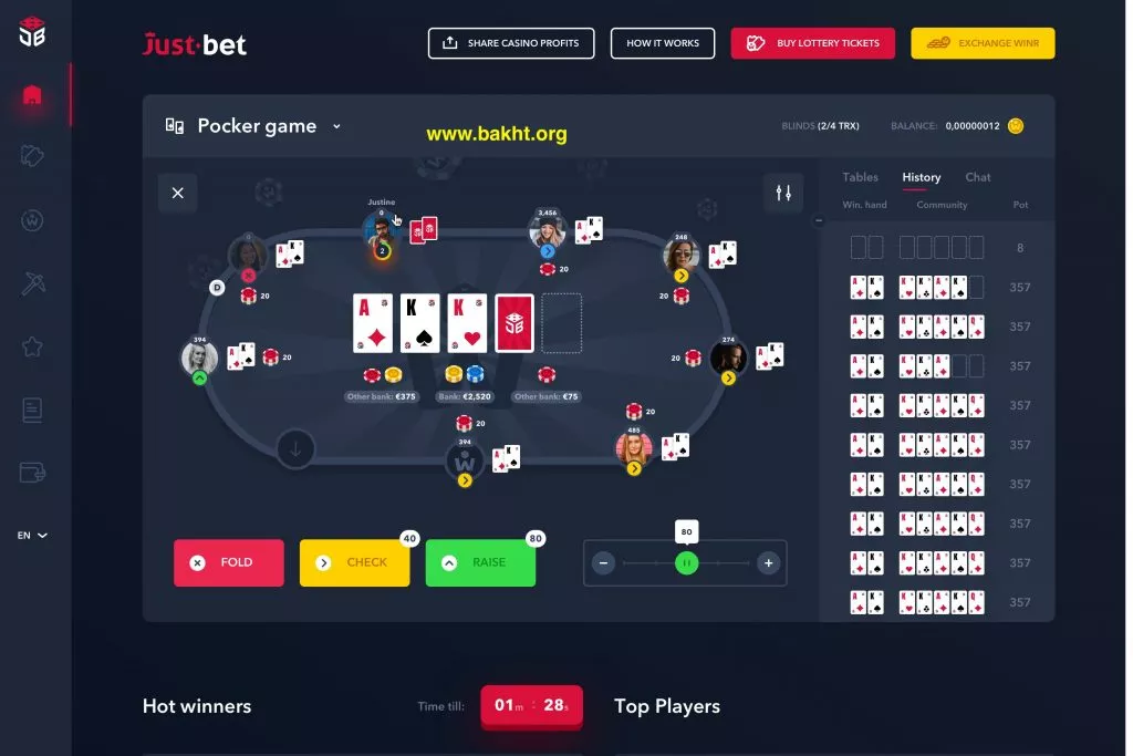 تعداد بازیهای تحت پوشش در جاست بت زیاد نیست. اگر قبلا سابقه حضور در سایتهای شرط بندی کلاسیک را دارید، برای بازی کردن در جاست بت نباید دچار مشکل بشوید. تمام بازیها آشنا هستند و قوانین هم استاندارد خواهند بود. بازی پوکر سایت که بین بلاکچینیها شهرت دارد، به صورت تگزاس هولدم است. شما بعد از شارژ حساب میتوانید وارد میزی که میخواهید شوید. هر میز حداقل میزان توکن را به عنوان ورودی در نظر گرفته است. در آنجا در کنار چند نفر دیگر که مانند شما هستند، میتوانید برای توکنها بیشتر رقابت کنید. بازی در محیط مجازی برگزار می شود و کارت پخش کن کامپیوتر است.