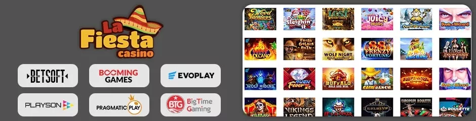 بررسیهای ما نشان می دهد که کازینوی لا فیستا با تعداد متنوعی از ارائهدهندگان نرمافزار همکاری کرده است تا بتواند مجموعهای خیرهکننده از بازیهای رومیزی، بازیهای اسلات، کارتها، بلک جک و موارد دیگر را ارائه دهد. ارائهدهندگان نرمافزار مورد استفاده توسط کازینوی La Fiesta عبارتند از: Play N’ Go، NetEnt، Playson، Fugaso، Felix ، Boong و موارد دیگر.