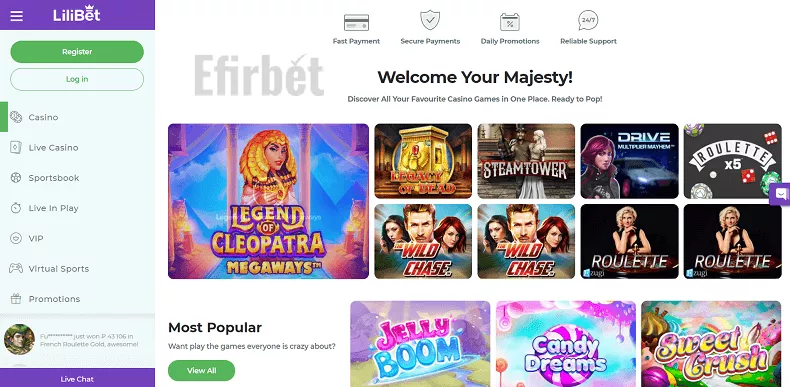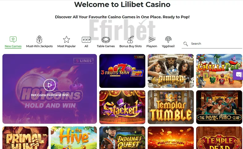 در کازینو لیلیبت هر آنچه برای سرگرم شدن لازم است، وجود دارد. از لحظه ورود به این بخش از سایت، بلافاصله تعدادی از داغترین بازیها را مشاهده میکنید. از نظر بازیهای کازینویی میتوان، گفت که این وب سایت جز بهترینها است. بازیها در این وب سایت به دستههای مختلف تقسیم شده است. از مهمترین دستههای بازی موجود در این وب سایت میتوان به موارد زیر اشاره کرد: