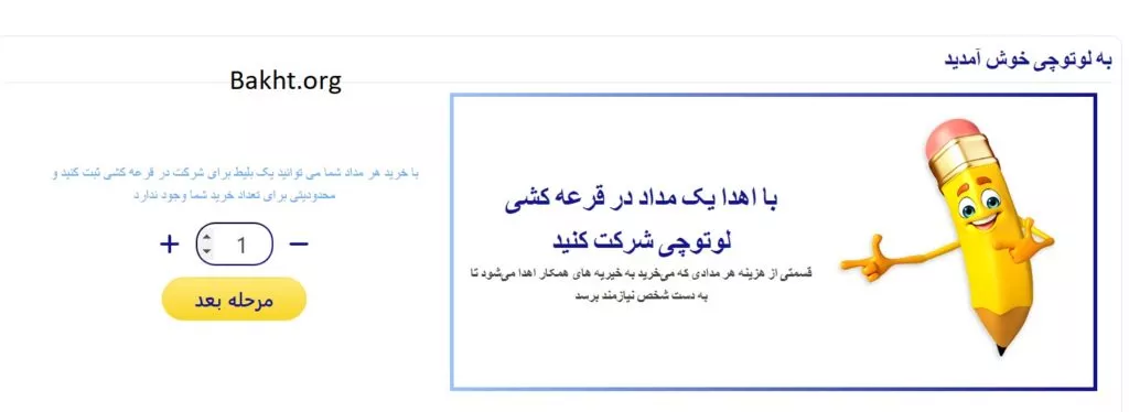 پس از ثبت نام در لوتوچی و ورود به حساب کاربری خود به بخش خرید بلیط بروید. در بخش اول از شما پرسیده میشود چه تعداد میخواهید به خیریه اهدا کنید. (طبق اعلام سایت به انتخاب این مدادها و پرداخت هزینه آنها، ضمن اهدای آنها با خیریه، شما در قرعه کشی هفتگی لوتوچی شرکت داده خواهید شد.)