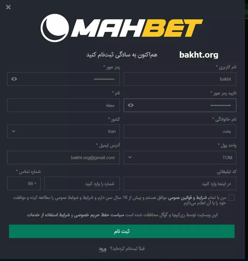 برای ثبت نام در سایت ماه بت، کافی است پس از ورود به سایت از بالای صفحه گزینه ثبت نام را بزنید. در فرم ثبت نام باید اطلاعات زیر را وارد کنید: