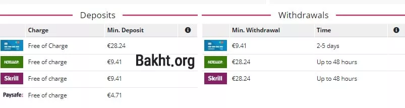 برای برداشت جایزه روش کارت بانکی، Neteller و Skrill روشهای در دسترس هستند، حداقل مبلغ قابل برداشت 9.41 یورو است که بین 2 تا 5 روز به طول میانجامد.