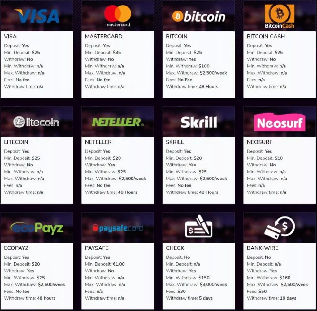 در حین نوشتن این بررسی درباره کازینو کلاب میامی، تحت تأثیر تعدد گزینههای بانکی آنها قرار گرفتیم؛ که اکثر آنها بدون کارمزد و بدون اتلاف وقت پردازش میشوند. حداقل و حداکثر مبلغ واریز و برداشت آنها نیز برای ما بسیار معقول به نظر میرسید. میتوانید تمام گزینههای بانکی موجود آنها را در بخش زیر بررسی کنید.