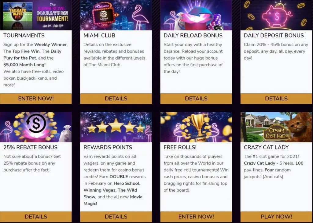 این پاداش سخاوتمندانه 800 دلاری در طول هشت سپرده اول شما تقسیم میشود. با هر واریز تا سقف 100 دلار 100% مطابقت کسب خواهید کرد. این پاداش نیاز به شرطبندی 20 برابری دارد که بسیار کمتر از آنچه توسط سایر کازینوهای آنلاین موجود در بازار ارائه میشود. به محض ثبت نام در Miami Club Casino، قطعاً باید از این جایزه استفاده کنید.