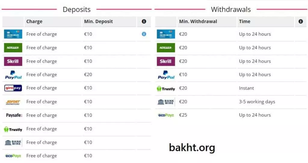 برای برداشت هم روش های معتبر در دسترس هستند، حداقل مبلغ برای برداشت 10 یورو است که واریز آن ممکن است بین 1 تا 5 روز به طول بیانجامد.