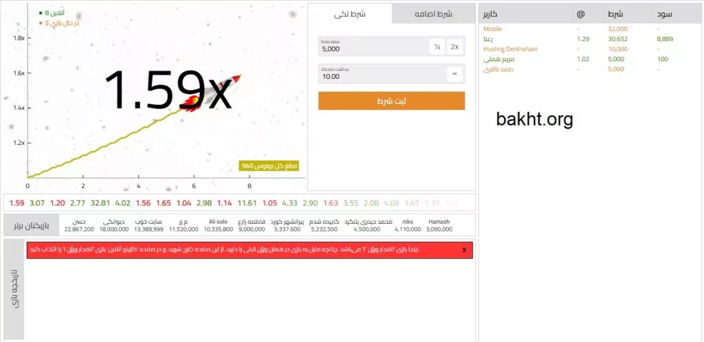 در صفحه بازی امکان مشاهده تاریخچه بازی و دیدن شرطهای ثبت شده وجود دارد که نشان میدهد ضرایب نسبتا قابل توجهی در میز انفجار این سایت به ثبت میرسد.