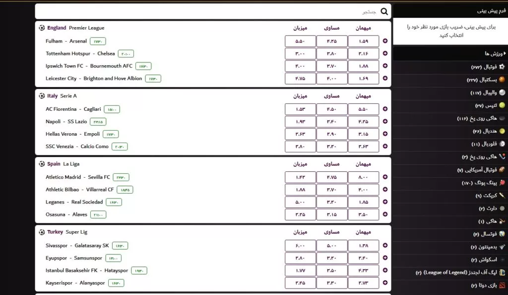 پس از از انتخاب رشته ورزشی از سمت راست صفحه، رویدادهای آن رشته را در سمت چپ میتوانید مشاهده کنید و شرط خود را انتخاب کنید.