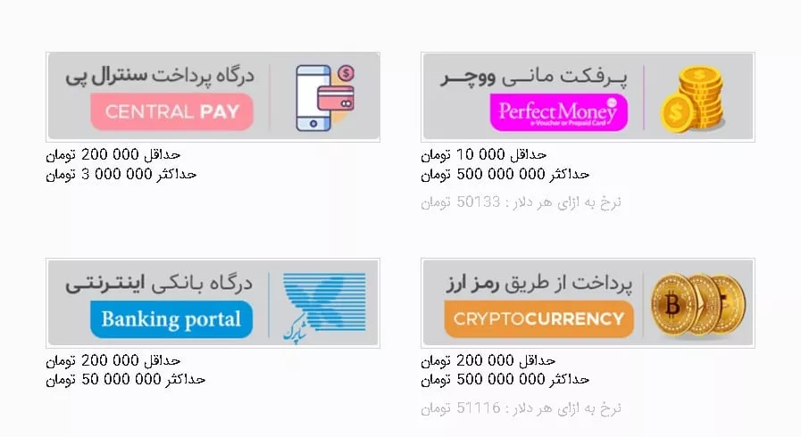 شارژ و برداشت از طریق ارزهای دیجیتال با حداقل 10 هزار تومان نیز امکان پذیر است. حداکثر مبلغ برای شارژ ریالی 50 میلیون تومان در نظر گرفته شده است.