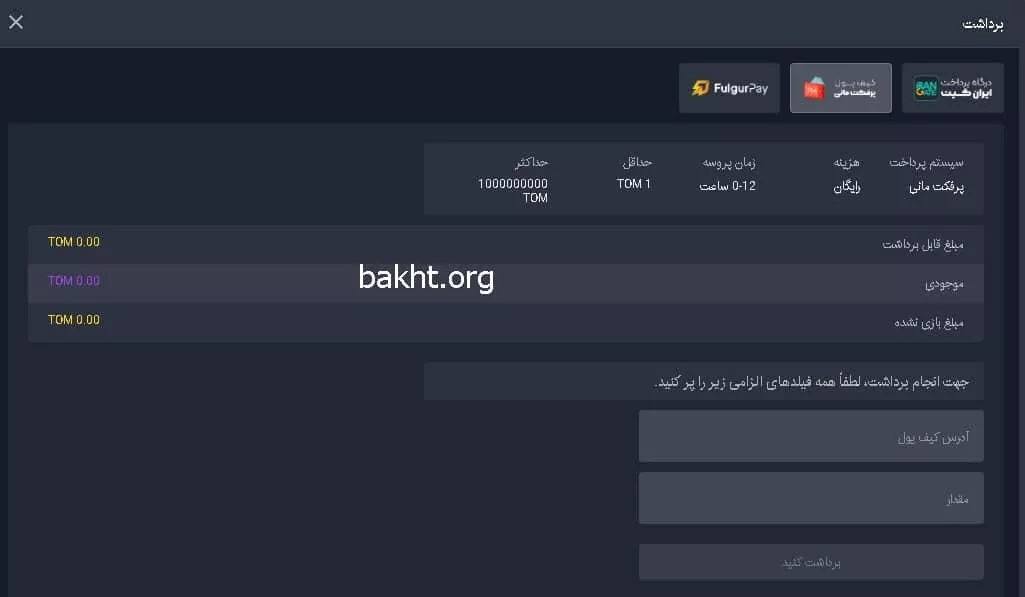 برداشت جوایز هم از طریق شماره شبا بانکی، هم از طریق پرفکت مانی و ارز دیجیتال امکان پذیر است. حداقل مبلغ قابل برداشت 200 هزارتومان و حداکثر 10 میلیون تومان در روز است.