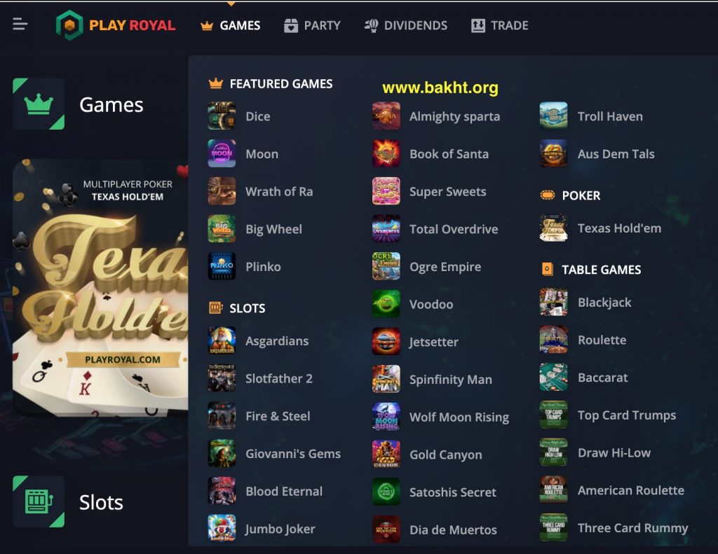 سایت شرط بندی پلی رویال (به انگلیسی: Play Royal)، یک سایت شرط بندی رمزارز در حوزه ترون است. پلی رویال برای برداشت و واریز جوایز از توکن ترون (TRX) استفاده میکند. بازیهای این سایت در چند دسته بازی رومیزی، بازی کازینو و بازی اسلات ماشین تقسیم بندی میشوند. تنوع بازیهای پلی رویال و طراحی جذاب و دیدنی، از عواملی است که این مجموعه موفق شده در دنیای شرط بندی ترون طرفدار جذاب کند. ما هم به همین دلیل تصمیم گرفتیم این سایت را از جنبههای مختلف مورد تحلیل قرار دهیم. مجله بخت