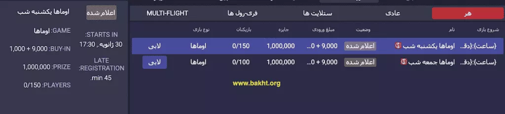 به صورت هفتگی معمولا در روزهای جمعه و یکشنبه، تورنمنت پوکر برگزار میشود. تاریخ دقیق تورنمنتها چند روز قبل از طریق سایت اعلام میشود. برای بازی کردن در تورنمنت باید حداقل مبلغ مورد نظر را پرداخت کنید. کسانی که تورنمنت را در رتبههای بالا به پایان میرسانند، حتی در شبکههای اجتماعی پوکربار معرفی میشوند. پوکربازان حرفهای زیادی در این سایت حضور دارند و بردن تورنمنت آسان نیست.