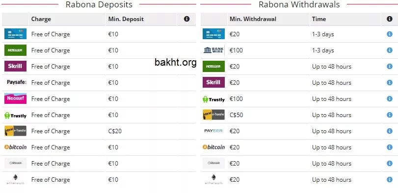 برای برداشت در سایت رابونا هم روشهای متنوعی در دسترس است و شما حتی میتوانید جایزه خود را به صورت بیت کوین دریافت کنید. حداقل مبلغ قابل برداشت 20 یورو است که واریز آن ممکن است از یک تا سه روز به طول بیانجامد.