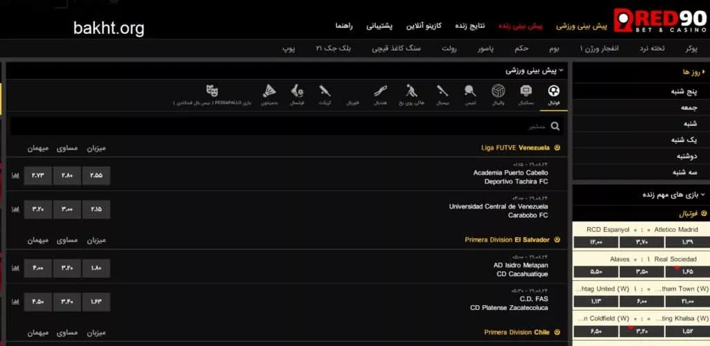 رد ۹۰ (Red90) یک سایت شرط بندی ایرانی است که با ارائه خدمات شرط بندی برای کاربران علاقمند در این حوزه امکاناتی از جمله پیش بینی ورزشی وکازینو آنلاین ارائه میکند.