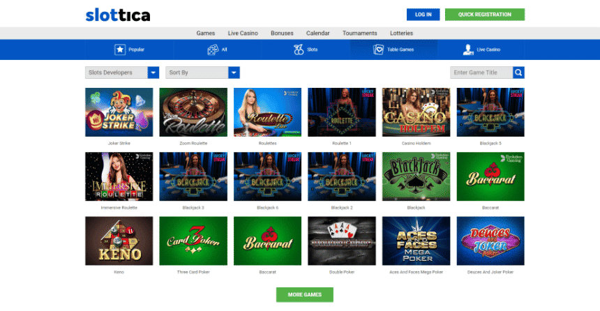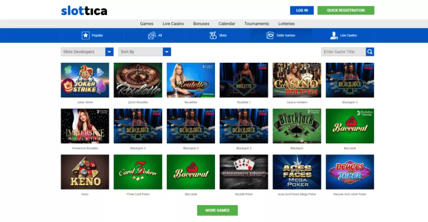 در بخش بازیهای رومیزی بیش از نوع بازی پوکر ویدیویی و همچنین چندین نوع بلک، پوکر و باکارات وجود دارد. بخش کازینو زنده اسلاتیکا خالی است و بازیهای کازینو زنده با بازیهای رومیزی ترکیب شدهاند.
