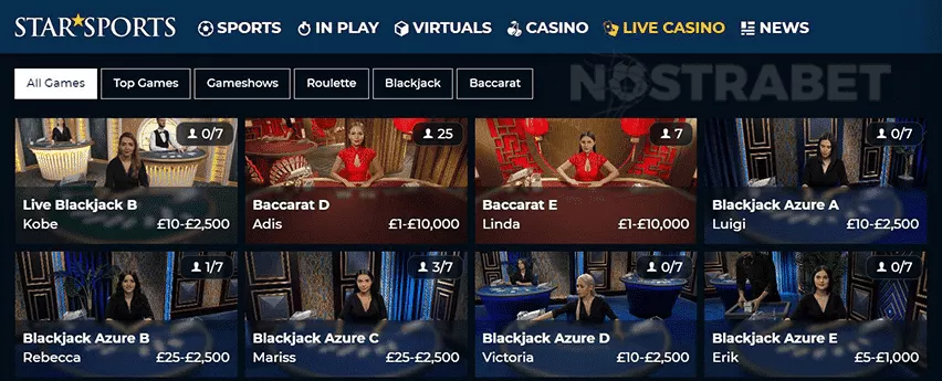علاوه بر کازینو عادی، استاراسپورتس دارای کازینو زنده است که میتوانید از حداقل 10 تا حداکثر 5 هزار پوند در آن شرط بندی کنید.