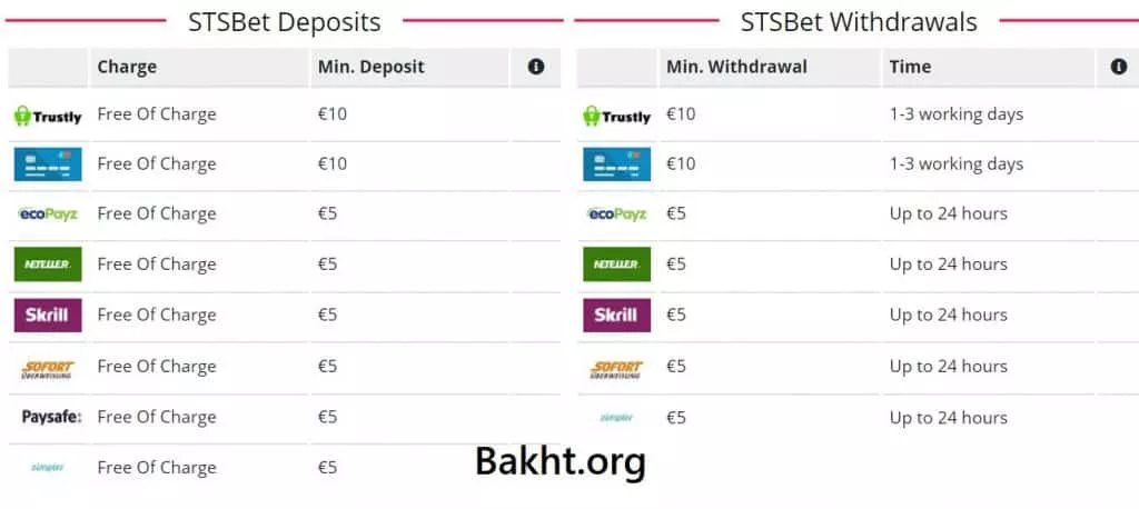 برای برداشت در سایت STSBet، روش های معتبر در دسترس هستند، حداقل مبلغ برای برداشت 5 یورو است که واریز آن ممکن است بین 1 تا 5 روز به طول بیانجامد.