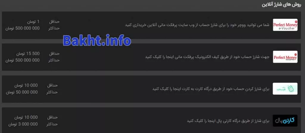 حداقل مبلغ برای شارژ حساب 10 هزارتومان (با کارت بانکی ایران) و 15 هزارتومان (برای پرفکت مانی) است و حداکثر مبلغ برای شارژ حساب 500 میلیون تومان برای پرفکت مانی و 3 میلیون تومان برای درگاه در نظر گرفته شده است.