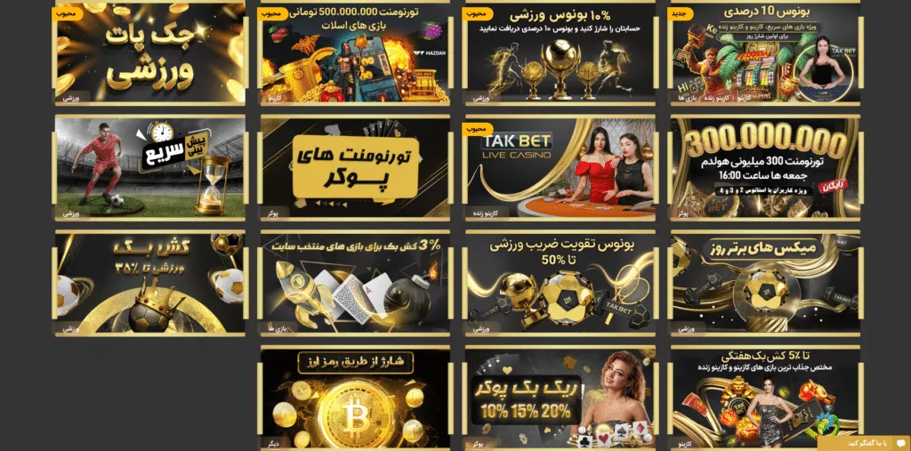 سایت تک بت برای همراهان همیشگی خود انواع بونوس ورزشی، کازینو، کازینو زنده و بازیهای سریع را ارائه میکند. در تکبت انواع تورنومنتهای میلیونی و میلیاردی پوکر به صورت روزانه و ماهانه برگزار میشوند.