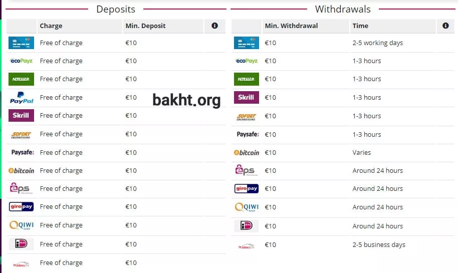 برای برداشت هم روش های مختلفی وجود دارد، حداقل مبلغ برای برداشت جایزه 10 یورو است که از بین 1 تا 5 روز ممکن است طول بکشد. واریز و برداشت از طریق بیت کوین نیز امکان پذیر است.