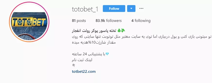 صفحه سایت شرطبندی توتو بت در اینستاگرام بیش از 80 هزار عضو دارد و توسط آذین هخامنش که نزدیک به نیم میلیون نفر فالوور در اینستاگرام دارد تبلیغ شده است. این وبسایت هم از اسکریپت های ایرانی استفاده میکند و از نظر امکانات تفاوت چندانی با سایر سایت ها ندارد.