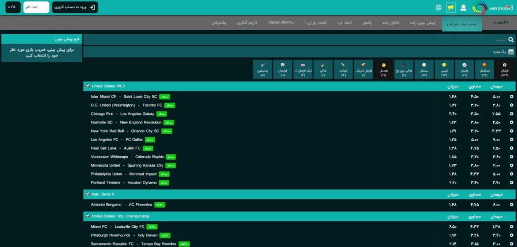با کلیک بر روی هر رشته ورزشی، بازیهای مربوط به آن در لیست نمایش داده میشود و میتوانید از میان آپشنهای متعدد پیش بینی خود را به ثبت برسانید.
