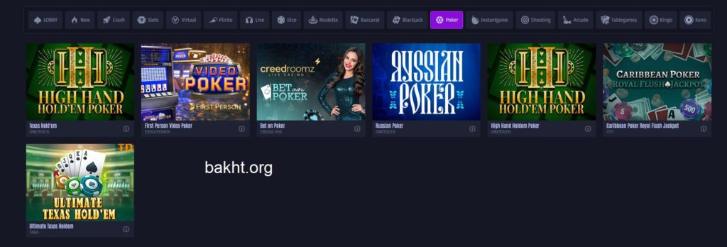بازی پوکر تگزاس هولدم، پوکر روسی، پوکر کارائیب و پوکر اوماها از جمله بازیهای پوکری هستند که در این سایت موجود است.