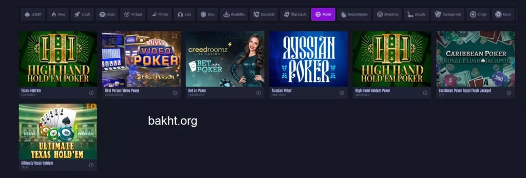بازی پوکر تگزاس هولدم، پوکر روسی، پوکر کارائیب و پوکر اوماها از جمله بازیهای پوکری هستند که در این سایت موجود است.