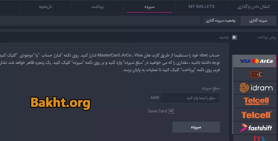 علی رعم اینکه سایت شرط بندی ویوارو بت از زبان فارسی پشتیبانی میکند، اما شارژ حساب فقط از طریق ویزاکارت و سایر روش هایی که مختص واحد پول ارمنستان است انجام میشود.