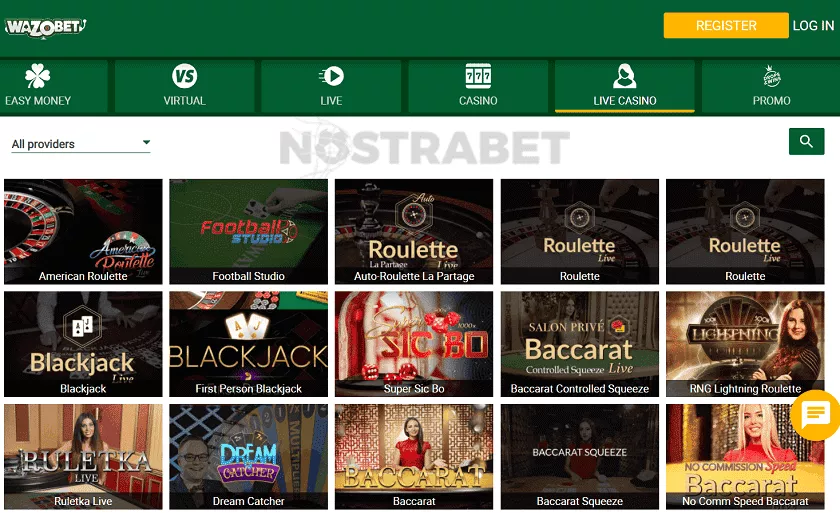 بازی پوکر تگزاس هولدم، بازی رولت، بازی بلک جک، بازی سیک بو از مهم ترین بازیهای کازینو زنده وازوبت محسوب میشوند.