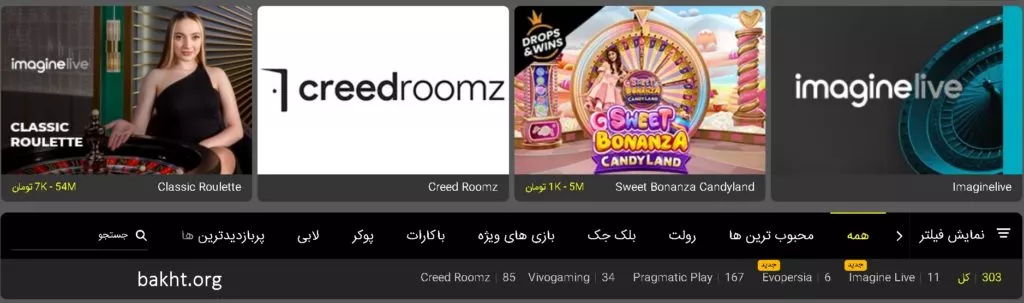 انواع بازی اسلات، بازی باکارات، بازی رولت، بازی بلک جک و بازی پوکر از توسعه دهندههای معتبر کازینویی در بخش کازینو قابل بازی کردن هستند.