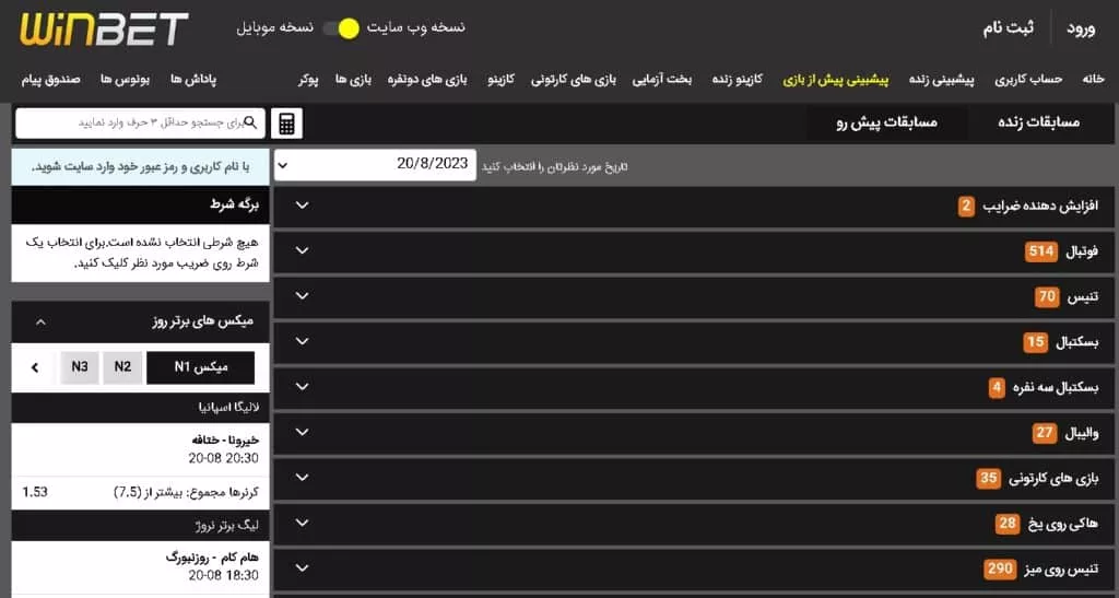 پیش بینی ورزشی یکی از بخشهای اصلی در سایت وین بت محسوب میشود. در این بخش نزدیک به 30 رشته ورزشی قابل پیش بینی هستند.