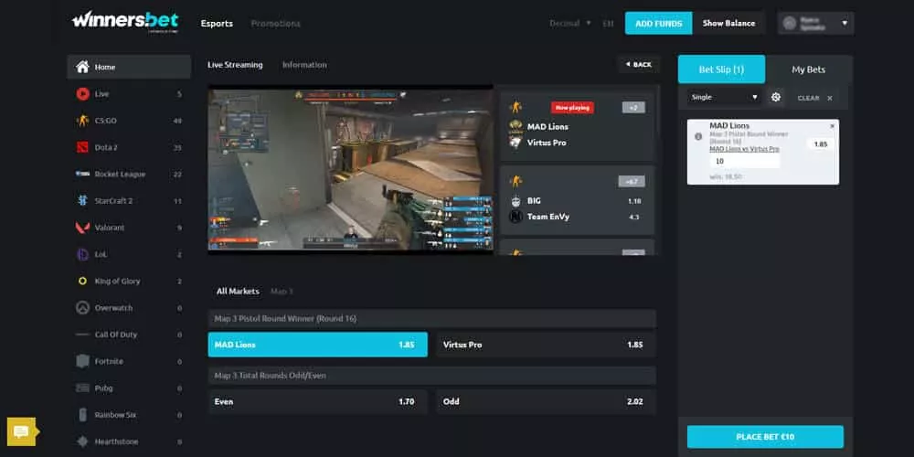 طراحی و رابطکاربری در ظاهر مشابه سایت Midnite است. برای پیدا کردن یک ورزش الکترونیکی که میخواهید روی آن شرطبندی کنید، فقط باید نماد مربوطه را در نوار کناری صفحه پیدا کنید. سپس، با یک طرح بسیار ساده از مسابقات، بازارها و رویدادها مواجه خواهید شد. بخش امور بانکی و جزئیات حساب شما رابطکاربری سادهای دارد و تنها بخش اصلی دیگر صفحه تبلیغات پاداش Winners.bet است.