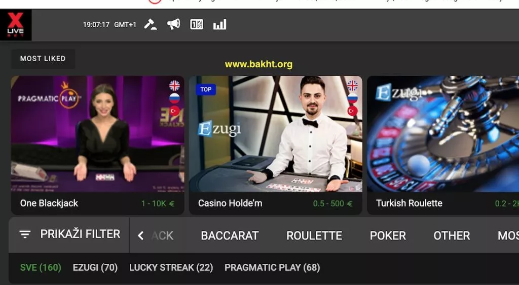 بازی my lucky از منوی بالای سایت به صورت مجزا و اختصاصی در دسترس است. این بازی شبیه گوی شانس است و شما باید منتظر خواندن اعداد باشید. اعداد به صورت کاملا تصادفی انتخاب میشوند. بازیهای کارتی همچون پوکر، بلک جک و پاسور در کازینو زنده پوشش داده میشوند. کازینو آنلاین بخش رولت هم دارد. کارت پخش کنها به سه زبان انگلیسی، روسی و ترکی عموما صحبت میکنند. به نظر میرسد محل اصلی کازینو در کشور ترکیه است.