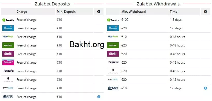 زولا بت علاوه بر پذیرش روش های معمول برای شارژ و برداشت. از بیت کوین هم پشتیبانی میکند. حداقل مبلغ برای شارژ حساب 10 یورو و حداقل مبلغ قابل برداشت 10 یورو است.
