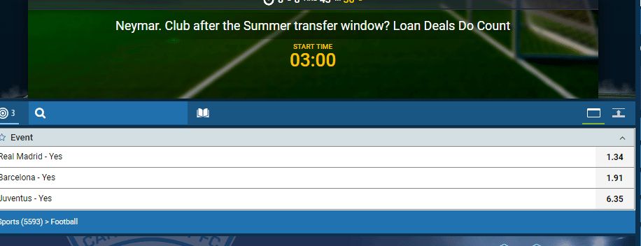 بر اساس ضرایب، اگر شما روی انتقال نیمار به رئال مادرید بخواهید 100 هزارتومان ببندید، 34 هزارتومان برنده خواهید شد، انتقال به بارسلونا 91 هزارتومان برای شما سود خواهد داشت.