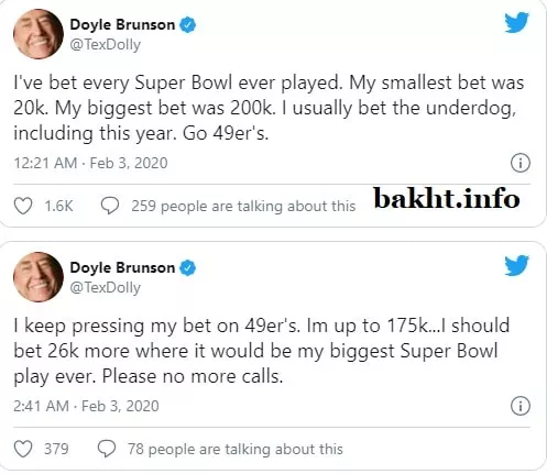 دویل برانسون متولد 1933 یکی از ثروتمندترین بازیکنان حرفهای تاریخ پوکر است. ثروت او را حدود 75 میلیون دلار تخمین میزنند. گفتنی است برانسون در سری جهانی پوکر ده بار در قسمتهای مختلف به قهرمانی رسیده است. او علاقه بسیاری به فوتبال آمریکایی و سوپربول دارد. امسال نیز مانند سالهای دیگر (شرط بندی روی سوپربول 2020)، شرطی سنگینی روی آن بست اما شکست خورد.