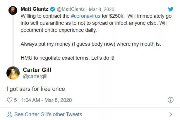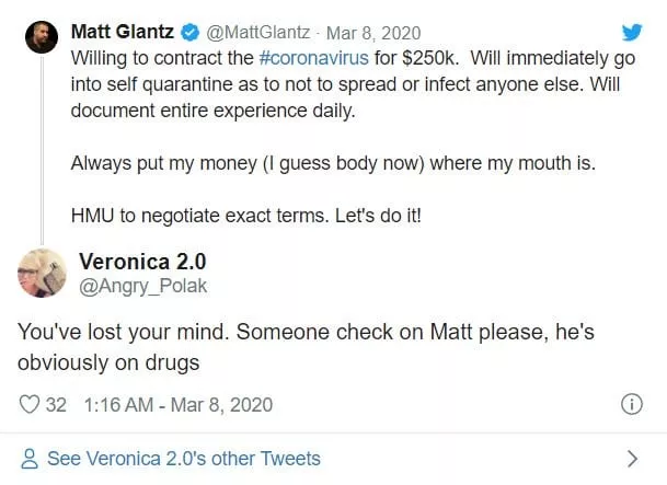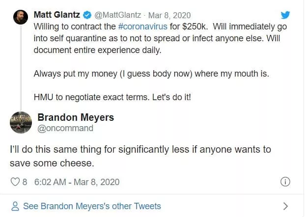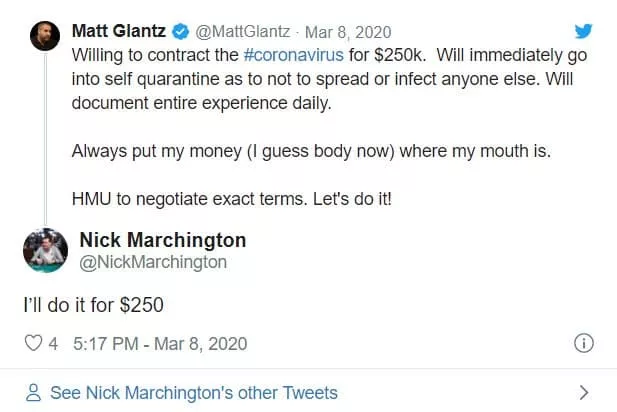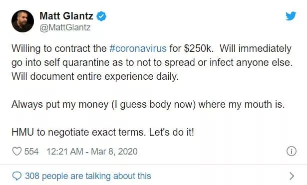 مت گلانتس، بازیکن نرخ بالای پوکر هفته گذشته از طریق حساب توئیتر خود، اعلام آمادگی کرد در ازای مبلغی 6 رقمی، کرونا بگیرد. او گفته تجربه اش در مواجهه با این ویروس را مستندسازی کرده و البته برای گسترش ندادن آن، خود را قرنطینه خواهد کرد: