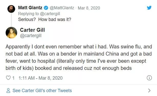 یکی به اسم کارتر جیل هم پیدا شد که تجربه اش در ابتلا به ویروی همه گیر دیگری را به اشتراک گذاشت و از روزگاری که به رایگان، سارس گرفته بود، صحبت کرد: